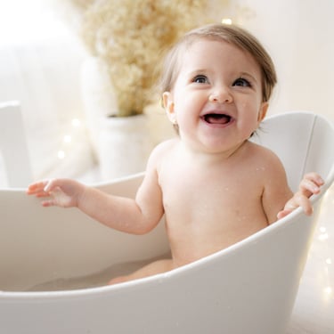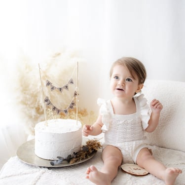 Antes se hacían con tarta real, pero ahora utilizo tartas falsas por higiene y seguridad del bebé. Y si te apetece, terminamos con un momento precioso: baño en bañerita.