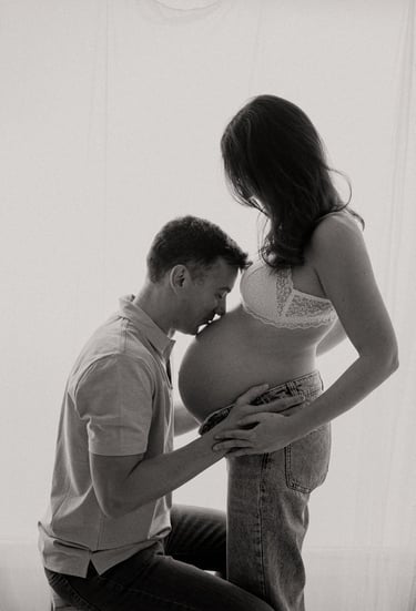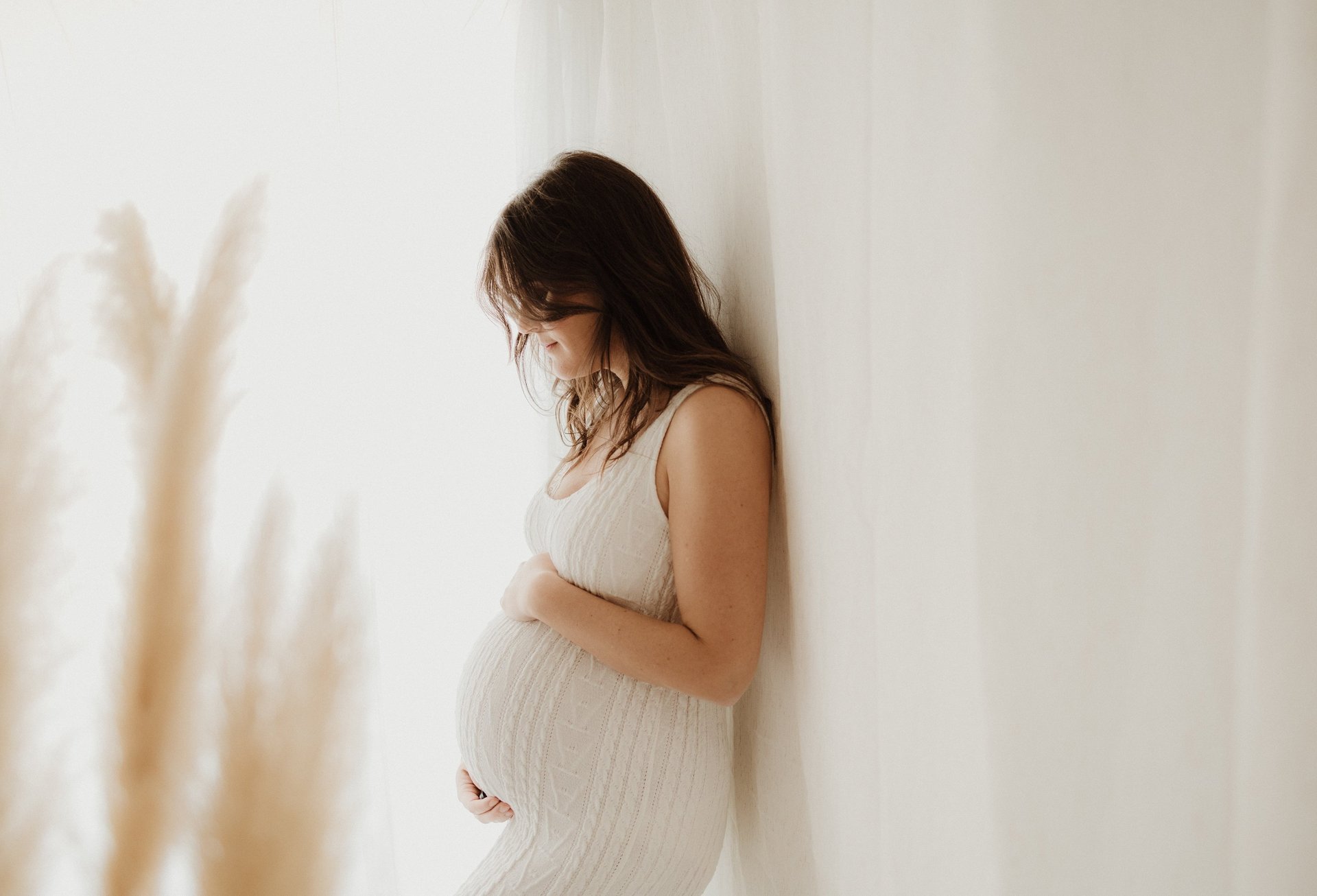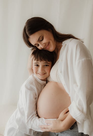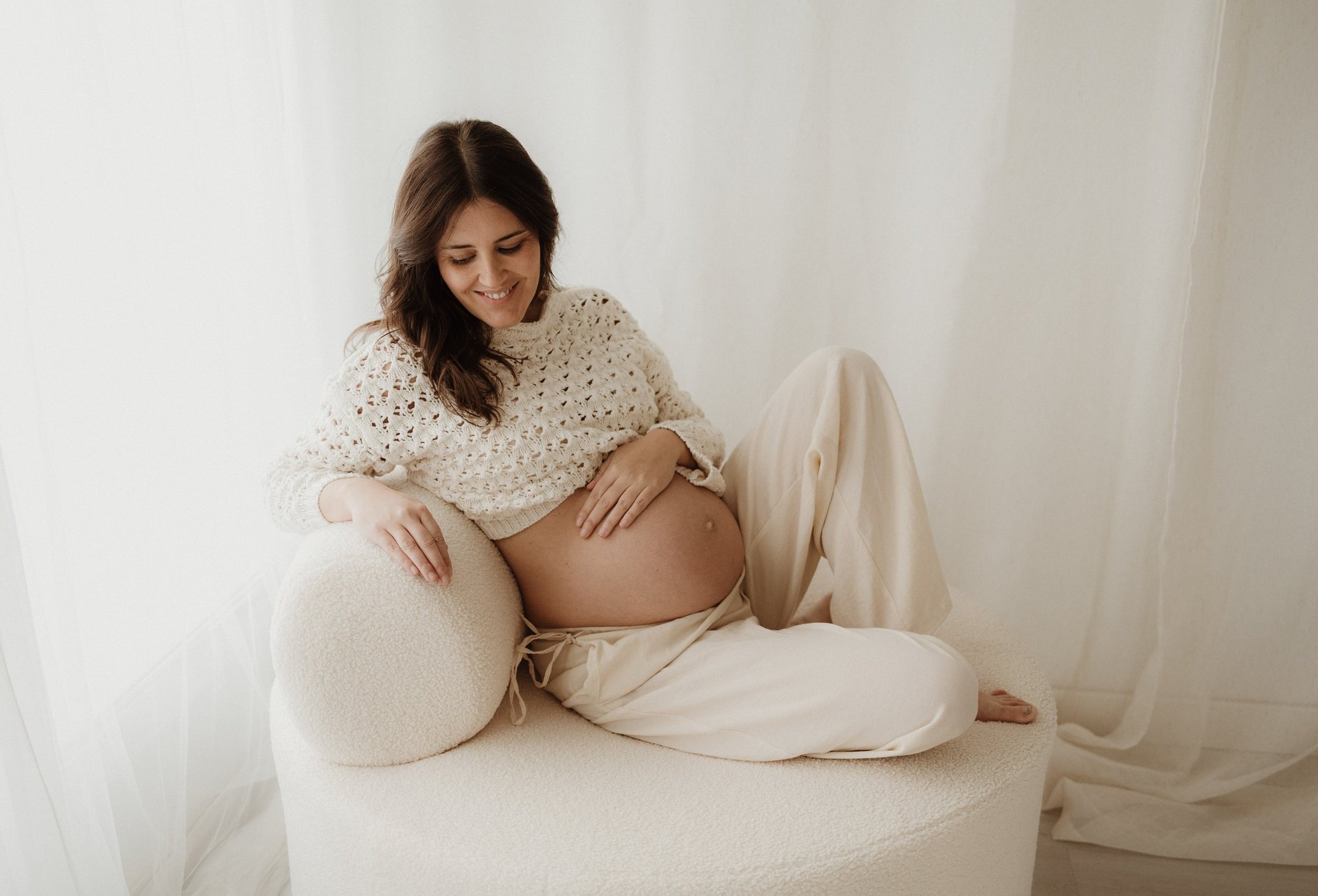 En Calma Fotografía realizo sesiones de fotos de embarazo en estudio en Alicante y Villena, con un estilo natural, minimalista y atemporal: luz suave, tonos neutros y emoción verdadera.